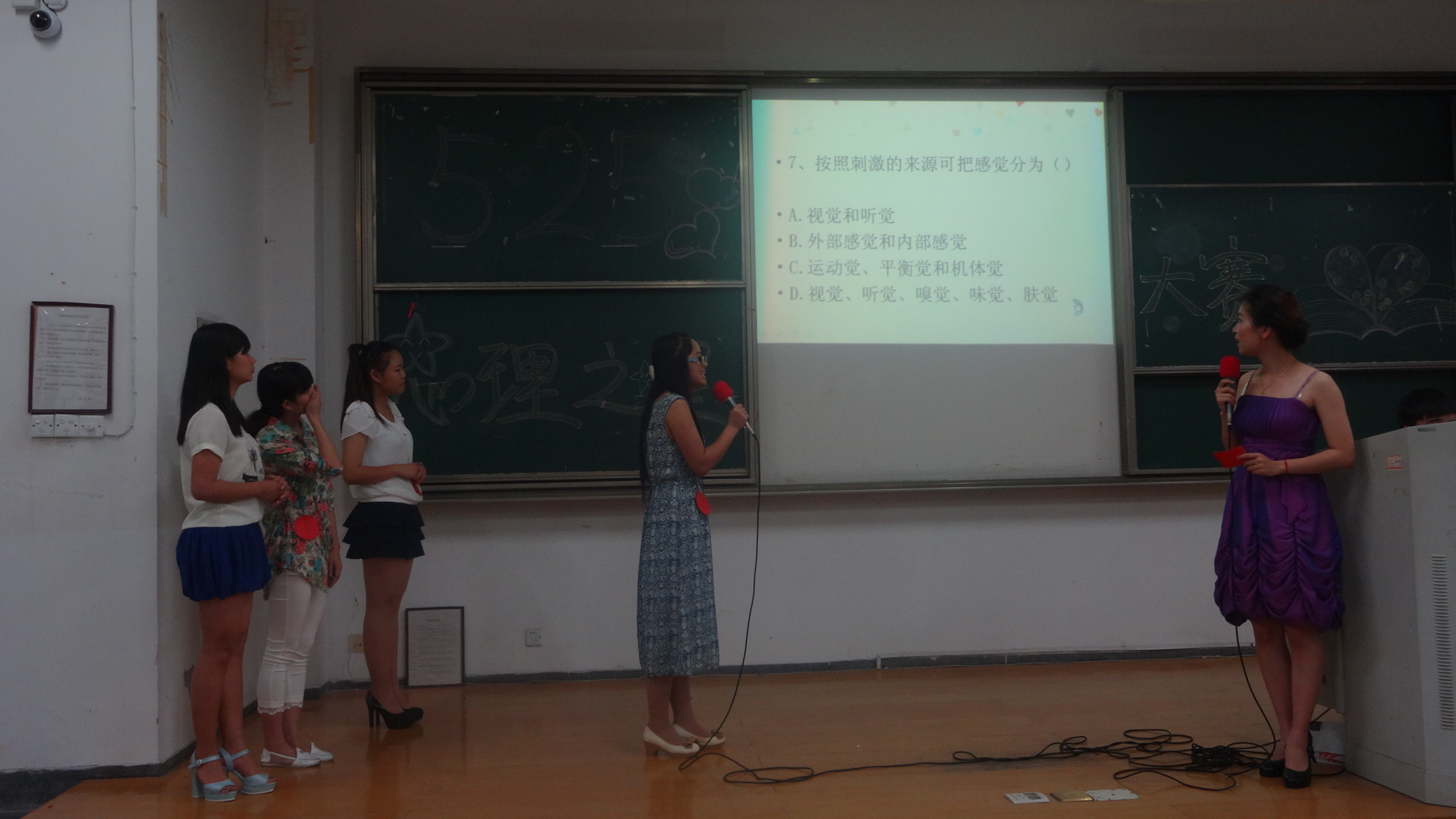 经过初赛激烈的角逐,有8位选手脱颖而出,将在本次决赛中继续征程。本次决赛共分三轮,第一轮自我解读占30分,第二轮知识抢答,每答对一题得3分,第三轮案例分析占40分。自我解读环节展示了每位选手对大学生心理健康的理解,并对自己目前的大学之旅中心理变化过程的介绍,同时展望自己未来的大学生活。在评委的点评后,选手们调整心态,重新定位自己的目标,力争在紧接着展开的知识抢答环节有更好的表现。一个个心理问题向选手们抛出,各选手快速思考,从容回答。有些选手给出的答案非常有趣,台上台下笑成一片。在场观众也都积极融入答题环节,忍不住为台上选手出谋划策。接下来的观众有奖竞猜环节则带来了整场决赛的第一个高潮,所有观众热情高涨,举手抢答问题,更有踊跃的观众大喊“主持人”以吸引注意参与问答。每位抢答成功并正确解答的观众均获得了精美小礼品一份。案例分析环节要求选手们运用一定的心理知识对给出的案例进行分析评价,各选手发挥机智,巧妙组织语言,以生动形象的描述向观众梳理案例,将自己对案例的见解娓娓道来,认真聆听的观众都被他们卓越的风采所征服。