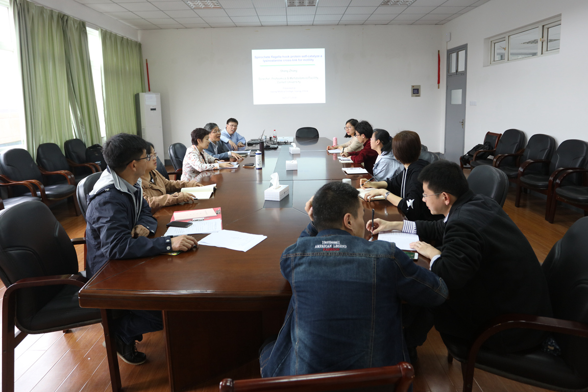 教师作了《Spirochaete flagella hook proteins self-catalyse a lysinoalanine covalent cross for motility》的学术报告。报告展示了张胜团队在康奈尔大学开展的当今世界前沿的蛋白绞联技术和蛋白互作技术的进展和应用,令教师受益匪浅。