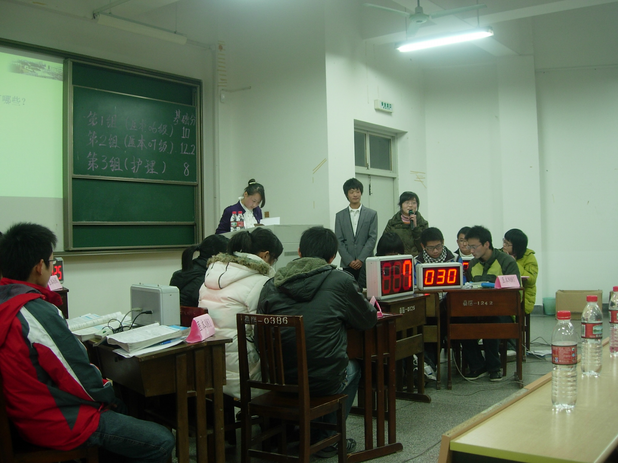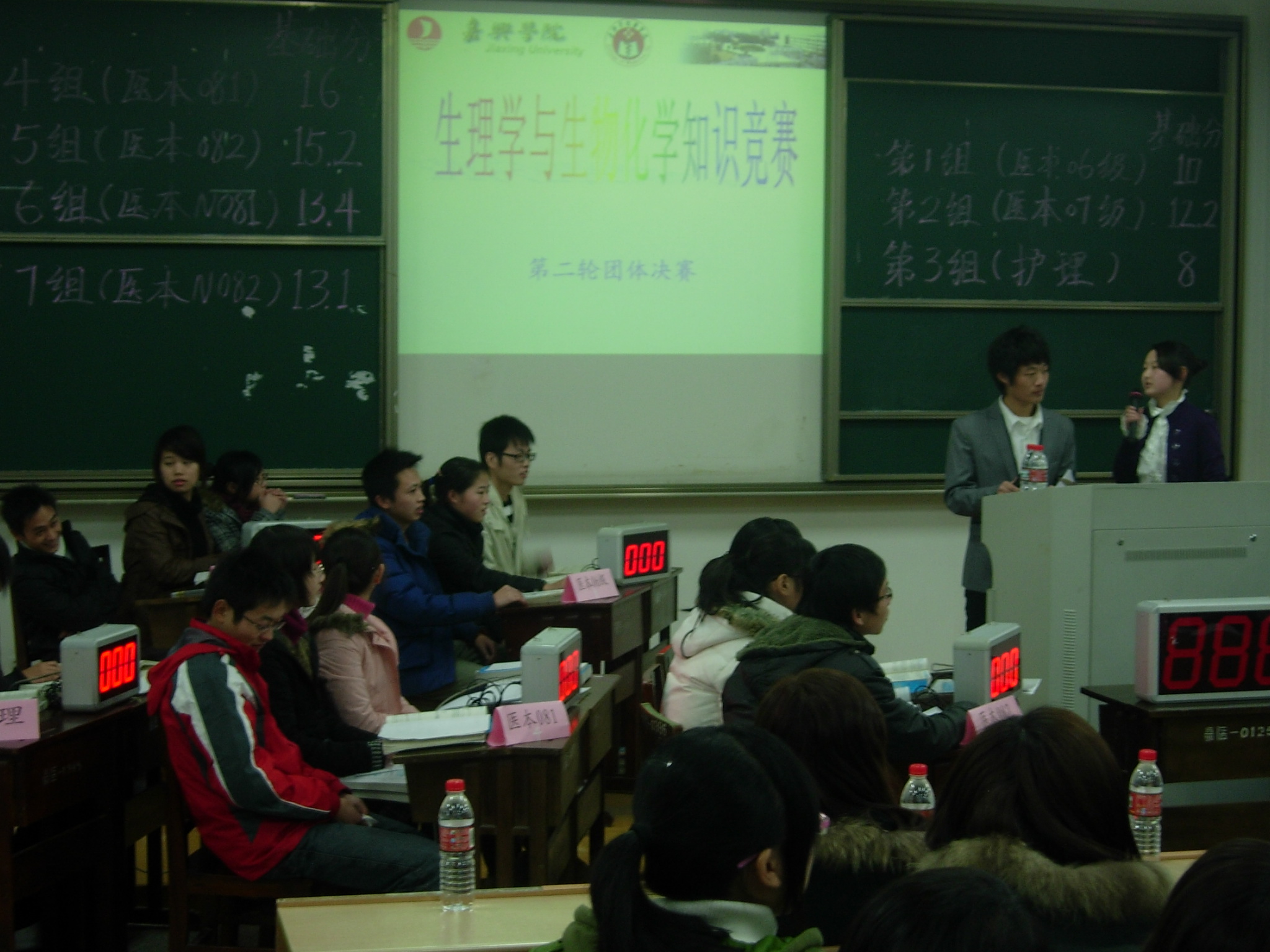 第二基础党支部在第四教学楼221教室举行了“生理学与生物化学知识竞赛”第二轮团体决赛。宋国杰院长、张杰书记、学工办主任蒋小红老师、团总支书记赵丽萍老师等作为嘉宾出席。参赛选手由06级、07级、08级的临床医学专业和护理专业的7支参赛队伍组成,由生理学教研室周新妹老师、生化教研室董波和韩冬老师担任评委。此前两周,第一轮竞赛即笔试部分已经完成。